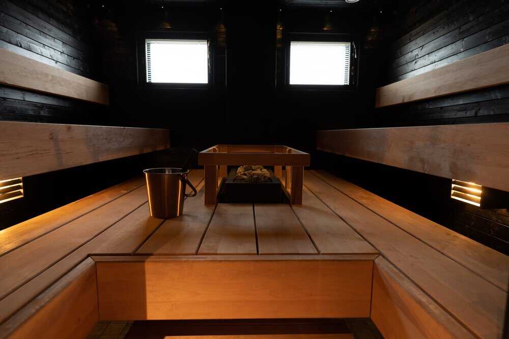 Privaatti-saunatila koostuu tyylikkäästi suunnitellusta lounge- ja pukuhuoneesta, tunnelmallisesta saunaosastosta, sekä wc-tiloista. Ulkoterassilla voi jäähdytellä löylyjen jälkeen.